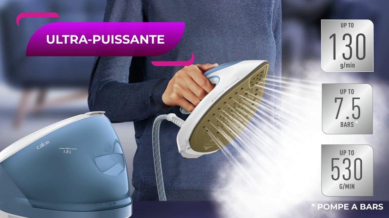 HAUTE EFFICACITÉ : centrale vapeur de 7,5 bars ÉCONOME EN TEMPS : centrale vapeur avec une fonction pressing allant jusqu'à 520 g/min pour les plis récalcitrants et les tissus épais RÉSULTATS PARFAITS : Débit de vapeur continu de 130 g/min pour des sessions de repassage très efficaces 100 % SÛRE : technologie sans réglage nécessaire pour minimiser les risques de brûler vos tissus repassables ANTICALCAIRE : collecteur de calcaire breveté pour des performances de vapeur durables GLISSE EXCEPTIONNELLE : Semelle Durilium AirGlide Autoclean qui reste propre au fil du temps et offre une glisse supérieure de 33 %*, soit la meilleure glisse de Calor RÉPARABILITÉ : un produit réparable pendant 10 ans, avec une livraison rapide et économique depuis 6 200 centres de réparation dans le monde entier, dans le cadre de notre engagement visant à protéger l'environnement et à réduire les déchets SYSTÈME DE VERROUILLAGE pour un transport et un rangement faciles et sécurisés FABRICATION FRANÇAISE : un produit haute performance conçu et fabriqué en France selon des critères de qualité stricts et un savoir-faire d'exception