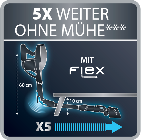 De Air Force Flex 460 draadloze steelstofzuiger brengt uitzonderlijke prestaties naar een hoger niveau. Ervaar het ingenieuze en flexibele ontwerp van deze nieuwe stofzuiger, dat stof oppikt dat tot 5 keer verder onder lage meubels ligt, met niet te evenaren prestaties en behendigheid. Schoonmaken was nog nooit zo eenvoudig! Deze krachtige draadloze steelstofzuiger kan met één klik worden omgevormd tot een handstofzuiger. De "Power Slim Vision"-zuigmond biedt grondige schoonmaakresultaten op alle vloeren, met een ongezien gebruiksgemak. Een uitgebreid assortiment van accessoires zorgt ervoor dat ieder oppervlak gestofzuigd kan worden in slechts één klik.