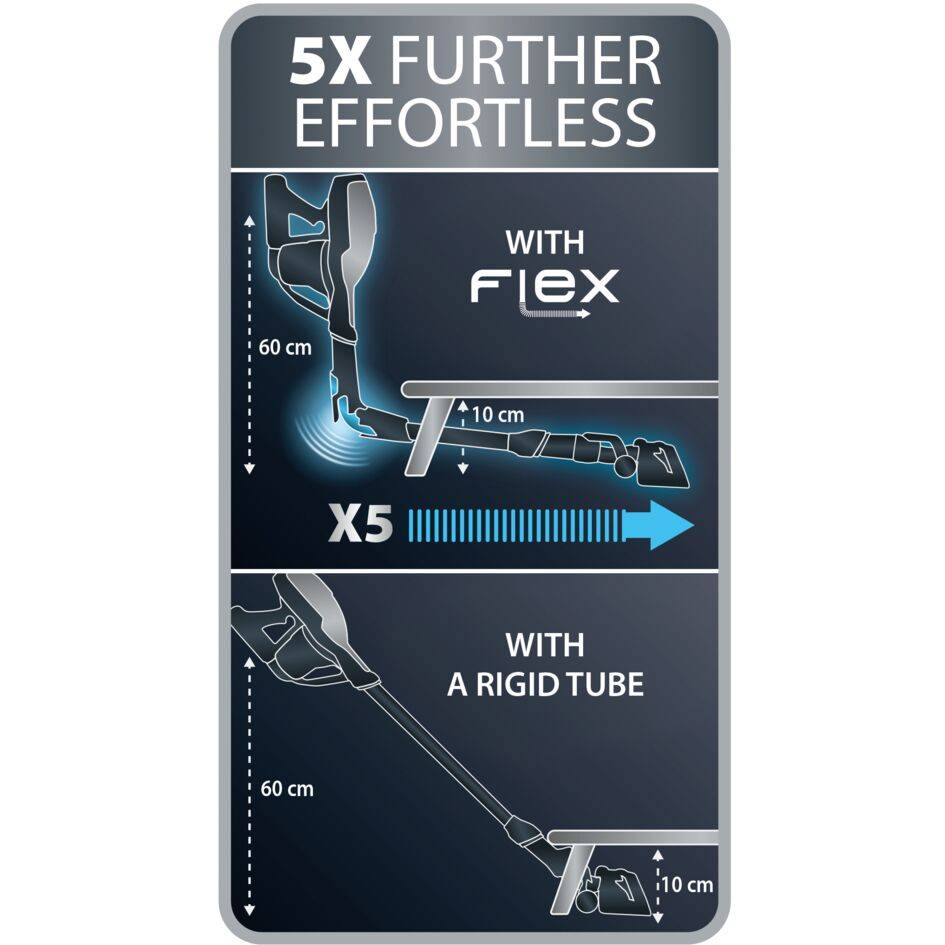 Ervaar de Air Force Flex draadloze stofzuiger, met een ingenieuze flexibele buis die tot 5 keer verder onder lage meubelstukken geraakt zonder voorover te buigen. Spoor stof op voor een vlekkeloos huis in een mum van tijd, met grote zuigkracht van 100 Air Watts en een Lithium-ion batterij voor 45 minuten autonomie.* Snel in rechte lijnen en behendig in de hoeken, deze draadloze stofzuiger is gemaakt om te imponeren, grenzeloos en met niet te evenaren prestaties. De unieke zuigmond—met LED verlichting die alle stofdeeltjes opspoort—en geïntegreerde borstels zijn geschikt voor elk deel van je huis, van vloer tot plafond: parket, vloertegels, tapijten, onder lage meubelstukken, en perfecte controle rond fragiele meubelstukken. Dit model beschikt over een Animal Care Kit, ideaal als je huisdieren hebt, met o.a. een mini elektro-borstel. Ga op avontuur...!